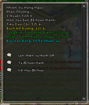 + Nhiệm Vụ ngày 3/3 : Bạn cần bấm vào NPC Cổ Phong Hà để reset ngày mới , để hiện thỉ tại Nhiệm Vụ Hoàng Kim chính xác hơn